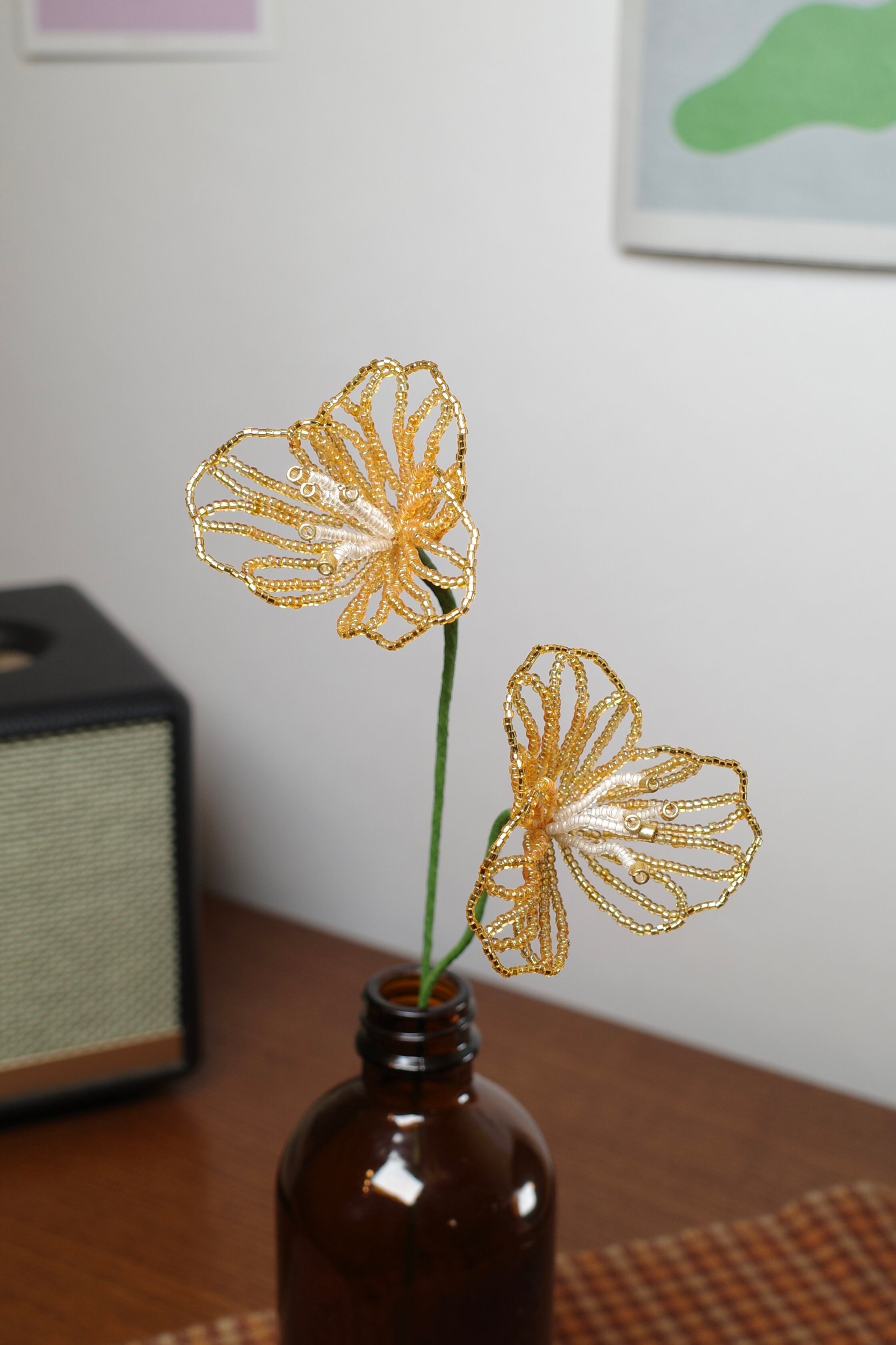 ※ビーズはガラス製のため太陽光のもと長期間保管すると色褪せの原因になります。屋外等でのご使用はお控えください。またワイヤー(針金)には金属を使用しているため湿度の高いお部屋には置かないでください。